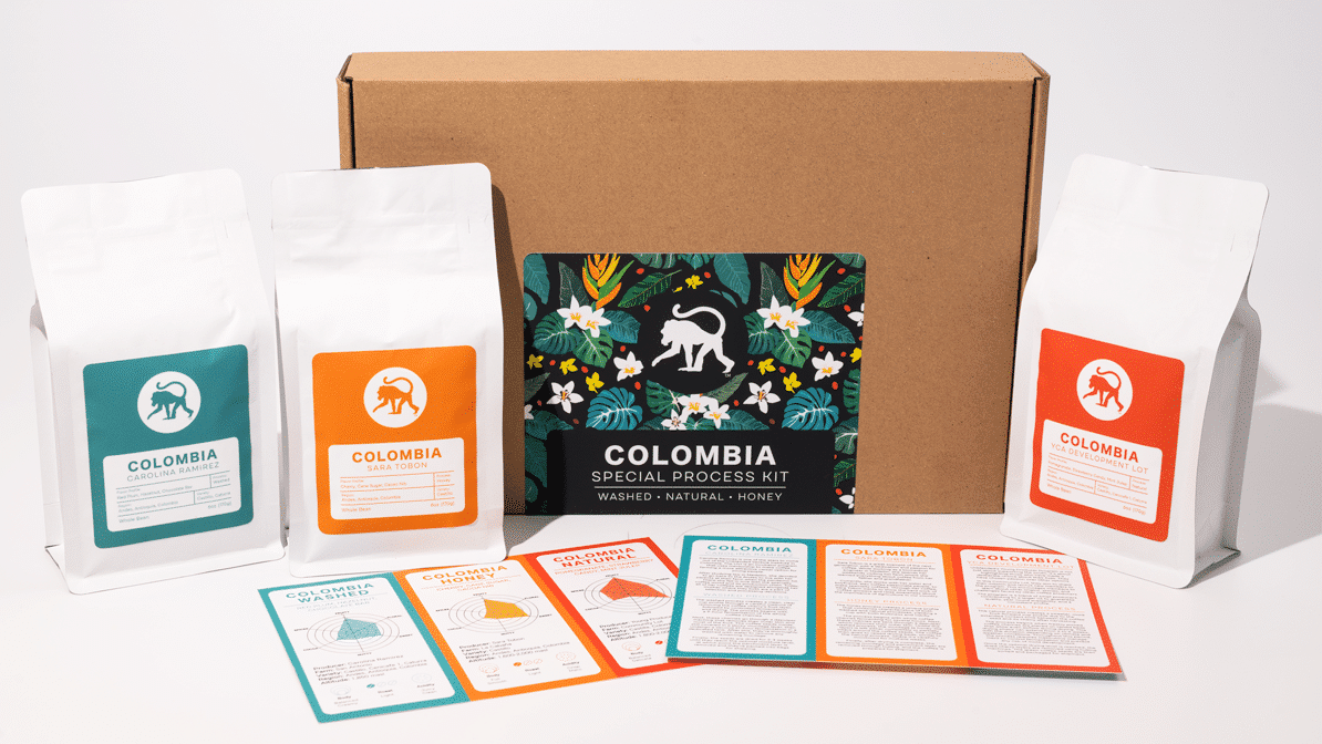 The Colombia Special Process Kit is available for a limited time. Each kit contains three 6oz bags featuring washed, honey, and natural processed coffees from the Antioquia region of Colombia.