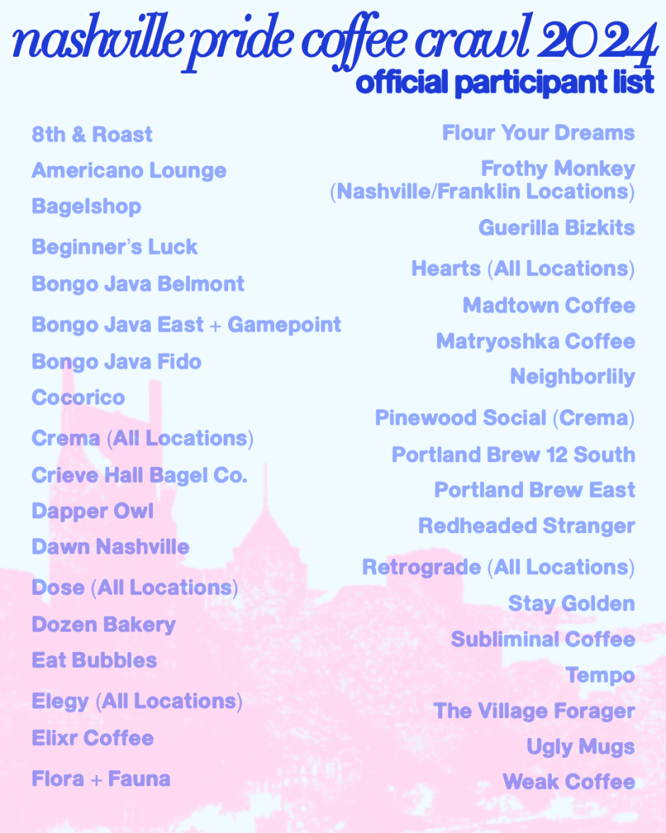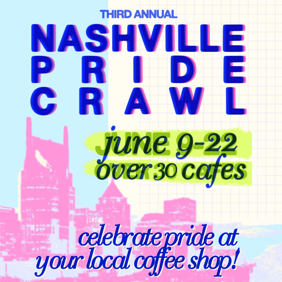 Celebrate Pride and enjoy the Nashville Pride Coffee Crawl with Frothy Monkey, Matryoshka and over 30 additional participating coffee shops and cafes!