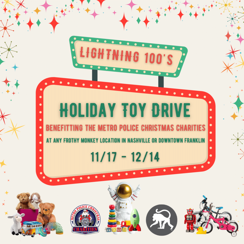 Each year, our Nashville area Frothy locations serve as drop-off points for Lightning100 and Metro Police Christmas Charities annual Toy Drive! New toys will be collected between 11/15 and 12/15 for distribution through the Metro Police Christmas Charities Basket Program on Christmas Eve!