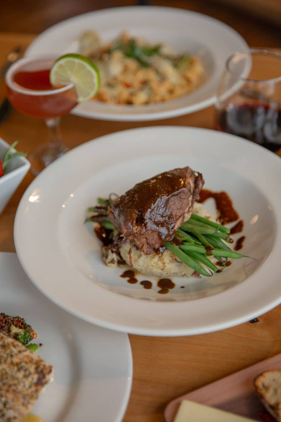 Next, dive into your main entree. You’ll choose between Red Wine Braised Beef Sirloin, Her Crusted Mahi, or Grilled Chicken and Sun Dried Tomato Pesto Campanelle for your entrees.