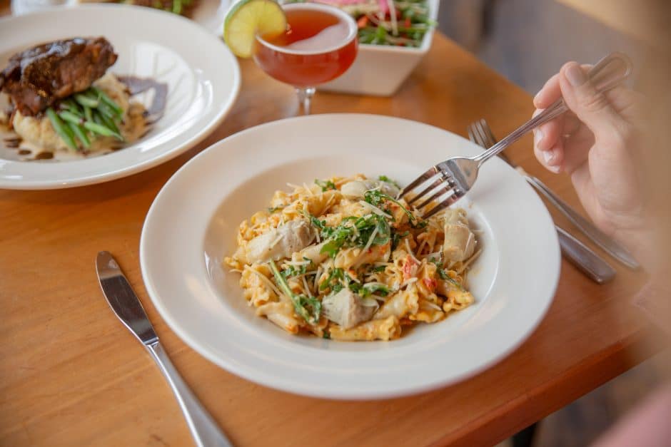 Both the Red Wine Braised Beef Sirloin and Her Crusted Mahi are Gluten Friendly*. If you are vegetarian, we can omit the chicken from the pasta dish and substitute balsamic roasted Portabella mushroom.