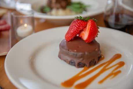 Dessert is included! Our Double Chocolate Flourless Cake is a delightfully rich, chocolate cake topped with a a fresh cherry and caramel sauce.