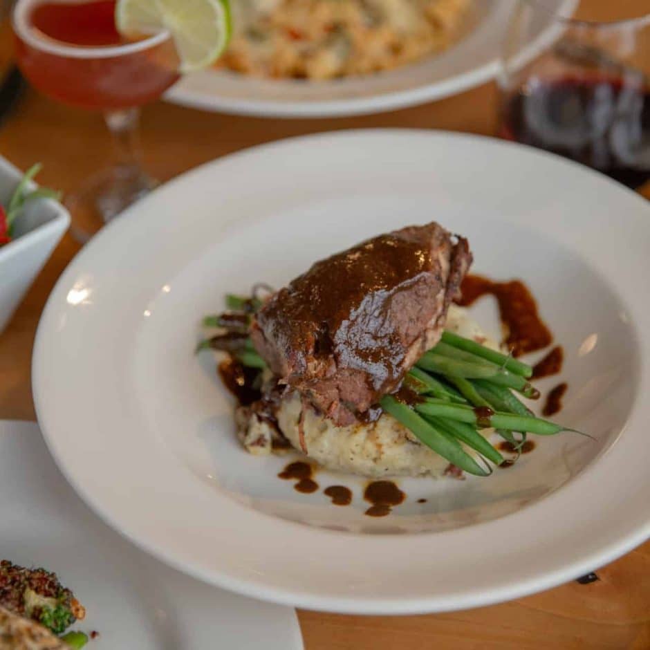 Red Wine Braised Beef Sirloin | over Roasted Garlic Mash Potatoes, Buttered Haricot Vert and Red Wine Pan Sauce